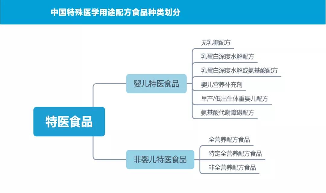 特醫(yī)食品在分類上主要分為嬰兒特醫(yī)食品(適用于0-12個(gè)月患者)與非嬰兒特醫(yī)食品(適用于1歲以上患者)兩種。其中嬰兒特醫(yī)食品分為無乳糖配方、乳蛋白深度水解配方、乳蛋白深度水解配方等六類針對不同體質(zhì)嬰兒的特醫(yī)食品種類。非嬰兒特醫(yī)食品則分為全營養(yǎng)配方食品,特定全營養(yǎng)配方食品和非全營養(yǎng)配方食品三類。