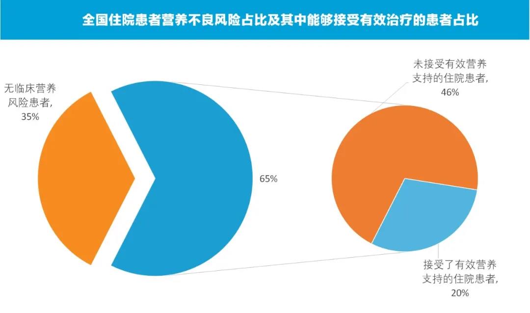 據(jù)《我國臨床營養(yǎng)學(xué)科的現(xiàn)狀與存在問題》中統(tǒng)計(jì)數(shù)據(jù)顯示,我國住院患者中約有65%的患者需要臨床營養(yǎng)支持,但是,其中沒有得到有效營養(yǎng)支持的患者占比70% 。國家統(tǒng)計(jì)局?jǐn)?shù)據(jù)顯示,我國2018年住院人數(shù)約為2.5億。由此數(shù)據(jù)推測,我國住院患者中約有1.6億人存在營養(yǎng)風(fēng)險(xiǎn),其中約有1.1億人沒有得到有效的營養(yǎng)支持。