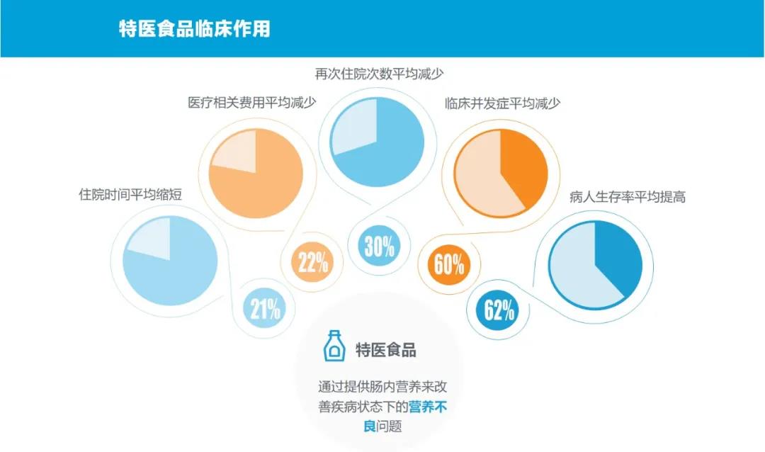 營養(yǎng)不良則是導(dǎo)致并發(fā)癥發(fā)生率、病死率、住院時(shí)間、住院費(fèi)用及再住院率增長的危險(xiǎn)因素。特醫(yī)食品則夠幫助病人改善其營養(yǎng)不良的狀態(tài)。特醫(yī)食品通過給予患者營養(yǎng)支持,能夠幫助患者提高免疫能力、減輕氧化應(yīng)激、維護(hù)胃腸道功能與結(jié)構(gòu)、降低炎癥反應(yīng)、促進(jìn)傷口愈合。并且,最終能夠?qū)颊咂鸬教岣呱媛省⒖s短住院時(shí)間,減少相關(guān)花費(fèi)、減少再住院次數(shù)、減少并發(fā)癥等作用。