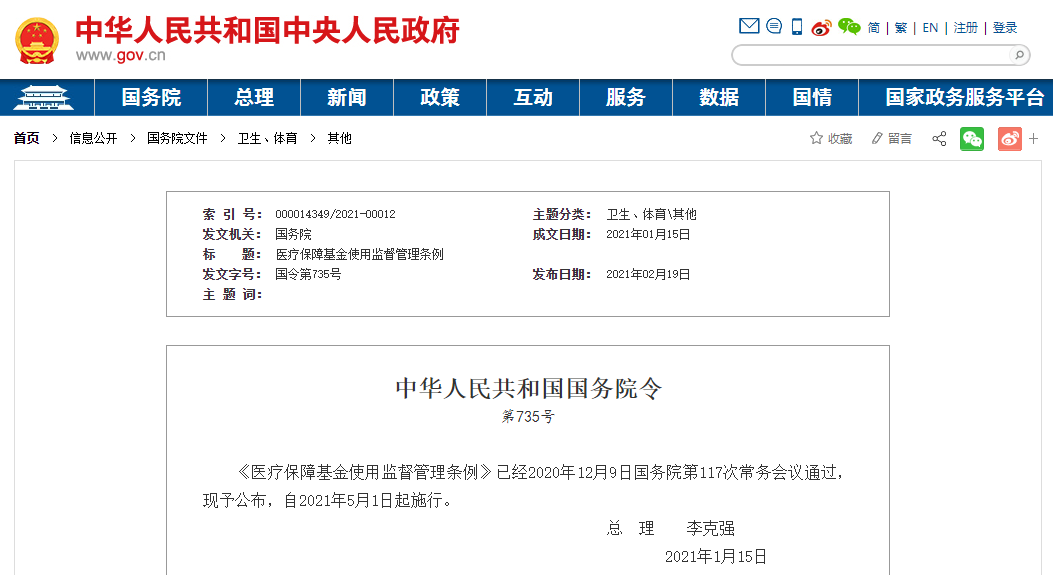 今日(2月19日),國(guó)務(wù)院發(fā)布《醫(yī)療保障基金使用監(jiān)督管理?xiàng)l例》(以下簡(jiǎn)稱(chēng)條例),2021年5月1日,該條例將正式施行。