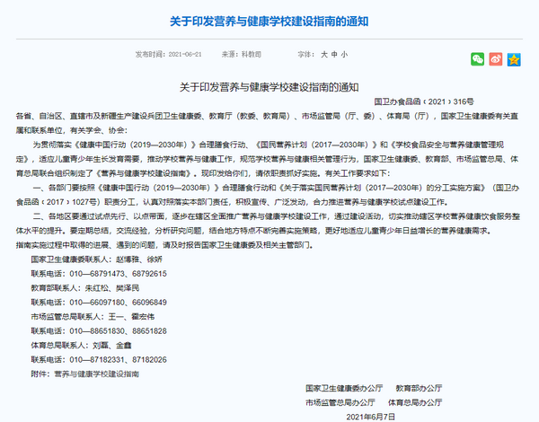 人民網(wǎng)北京6月22日電 (記者楊磊)近日,國(guó)家衛(wèi)生健康委辦公廳、教育部辦公廳、市場(chǎng)監(jiān)管總局辦公廳、體育總局辦公廳聯(lián)合發(fā)布《關(guān)于印發(fā)營(yíng)養(yǎng)與健康學(xué)校建設(shè)指南的通知》(以下簡(jiǎn)稱(chēng)《通知》)。