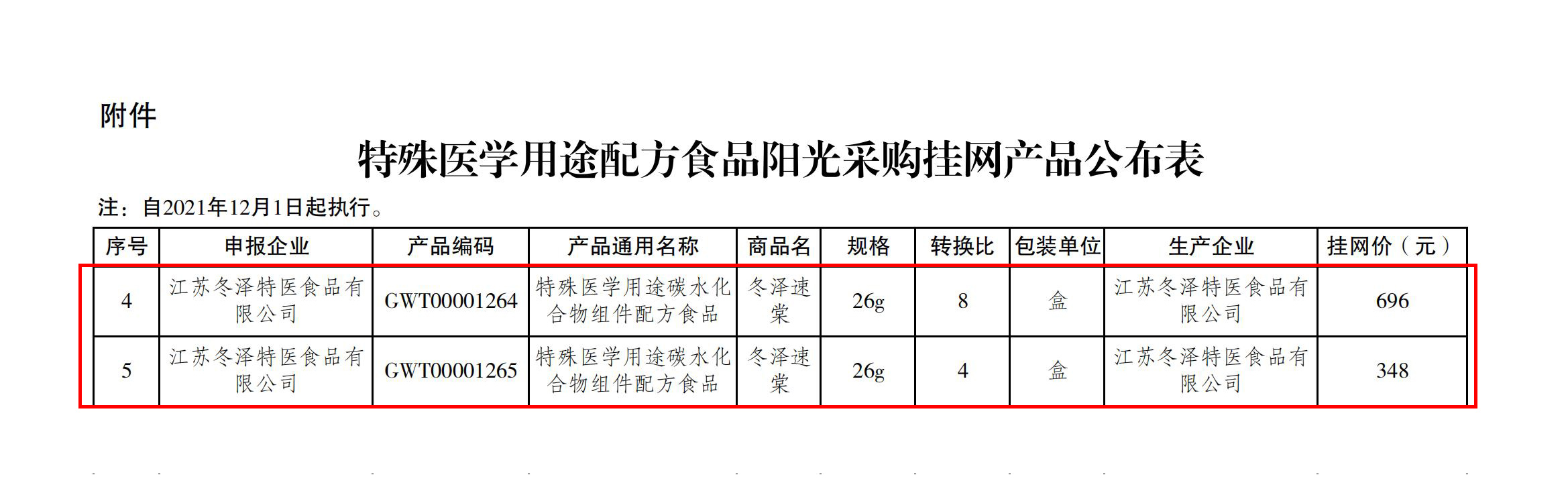 11月22日,江蘇省公共資源交易中心發(fā)布關(guān)于公布特殊醫(yī)學(xué)用途配方食品陽光采購掛網(wǎng)產(chǎn)品的通知,其中涉及到冬澤特醫(yī)的冬澤速棠。