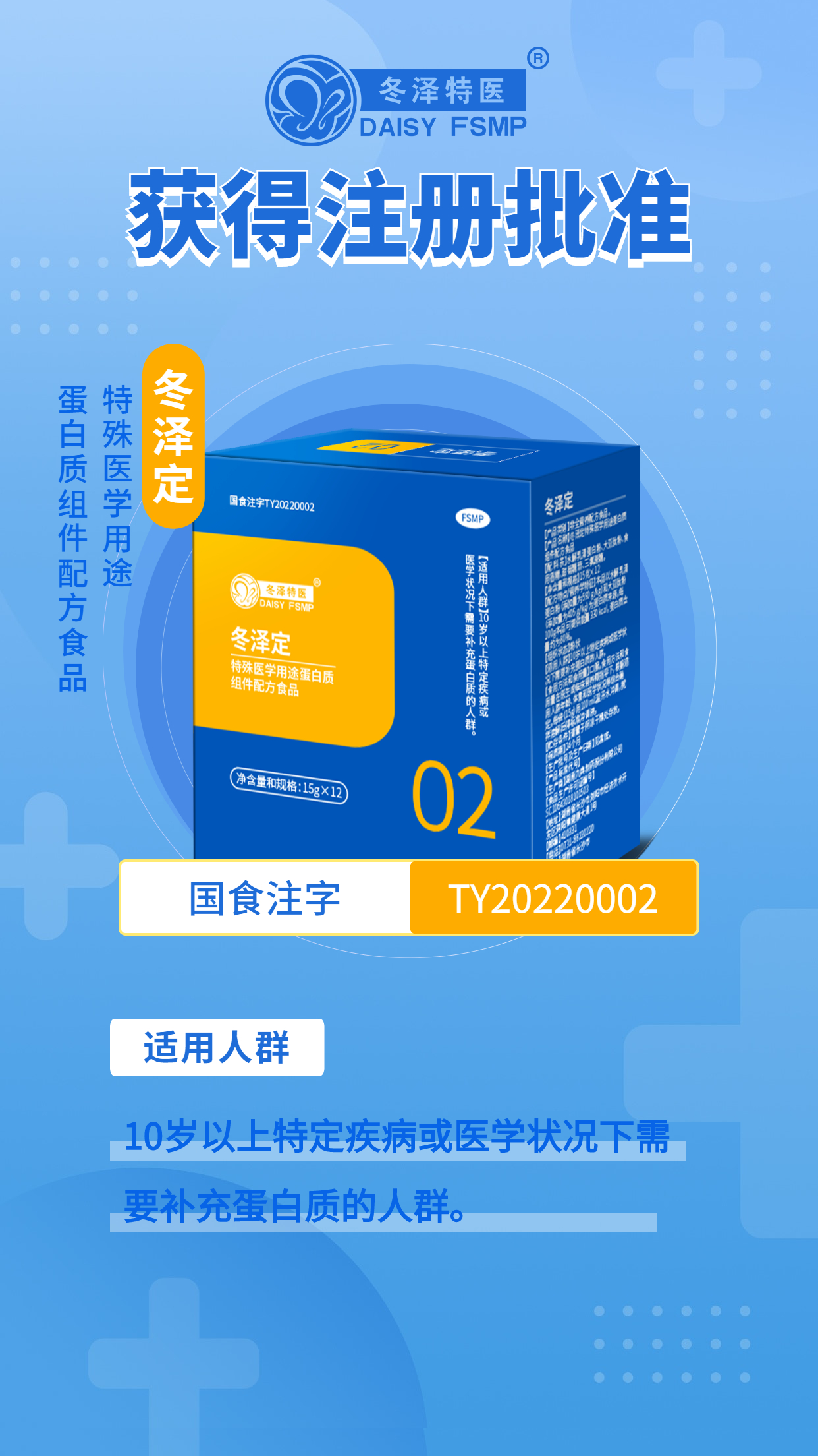 4月11日,冬澤特醫(yī)?冬澤定特殊醫(yī)學(xué)用途蛋白質(zhì)組件配方食品(以下簡稱冬澤定)獲得國家市場監(jiān)督管理總局頒發(fā)的“特殊醫(yī)學(xué)用途配方食品注冊(cè)證書”,批準(zhǔn)文號(hào)為國食注字TY20220002。