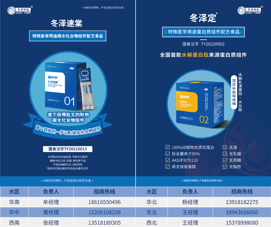 目前,我們冬澤特醫(yī)已經(jīng)擁有“冬澤速棠”(1歲以上碳水化合物組件)和“冬澤定”(全國首款水解蛋白肽來源蛋白質(zhì)組件)兩款獲批的特醫(yī)食品,接下來還有已通過現(xiàn)場核查的幾個(gè)品種即將面市,并且我們儲備了十余個(gè)具有特色的品種,均已取得受理批文,在此誠邀全國有志于發(fā)展特醫(yī)食品行業(yè)的銷售精英們,強(qiáng)強(qiáng)聯(lián)手。