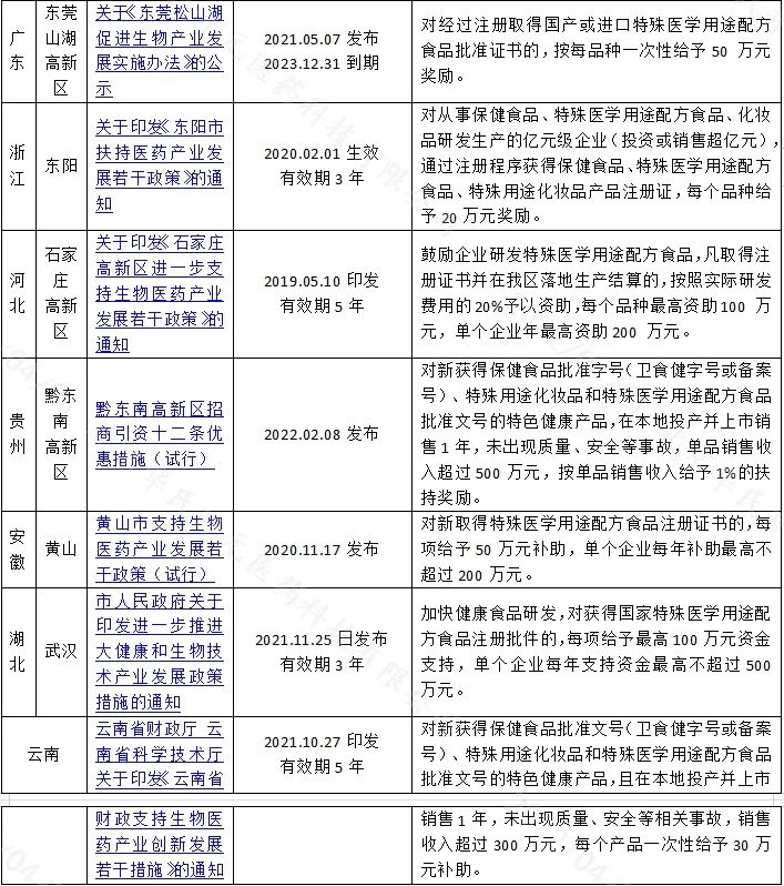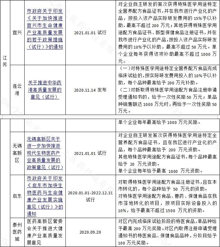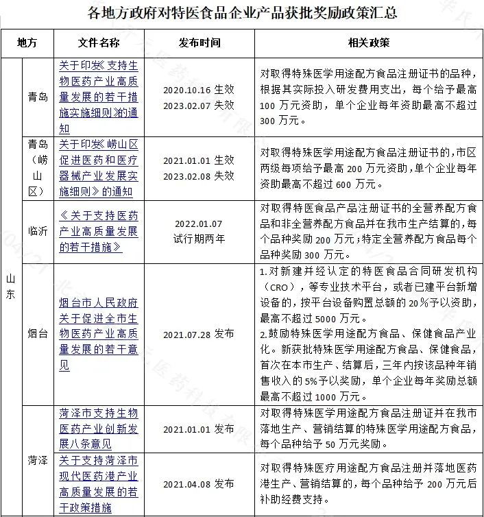 各地方政府對(duì)特醫(yī)食品生產(chǎn)企業(yè)產(chǎn)品獲批獎(jiǎng)勵(lì)政策匯總