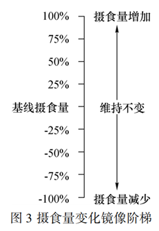 簡易膳食評價攝食量刻度尺與攝食量變化鏡像階梯可用于量化攝食量與攝食情況變化。攝食量刻度尺包括 0 ~ 10 級,其中 0 代表完全沒吃, 6 以上表示攝入良好,10 代表吃得最多。攝食量變化鏡像階梯以基線攝食量為 0,0 ~ 100%為攝食量增加, -100% ~0 為攝食量減少,患者可根據(jù)自己的攝食情況選擇相應(yīng)數(shù)字。具體評價標(biāo)準(zhǔn)見圖 2、3。圖片