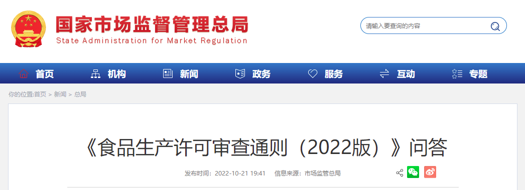 市場監(jiān)管總局關(guān)于發(fā)布《食品生產(chǎn)許可審查通則(2022版)》的公告及問答