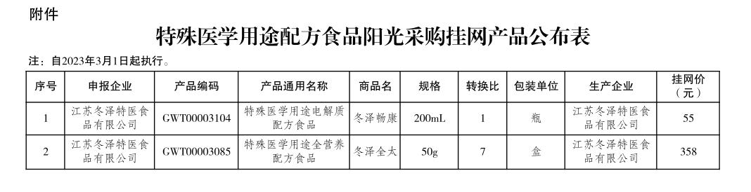 2023年2月23日,江蘇省公共資源交易中心發(fā)布了關于公布特殊醫(yī)學用途配方食品陽光采購掛網(wǎng)產(chǎn)品的通知,此次共公布了2款產(chǎn)品,其中涉及到冬澤特醫(yī)公司產(chǎn)品冬澤暢康,冬澤全太。