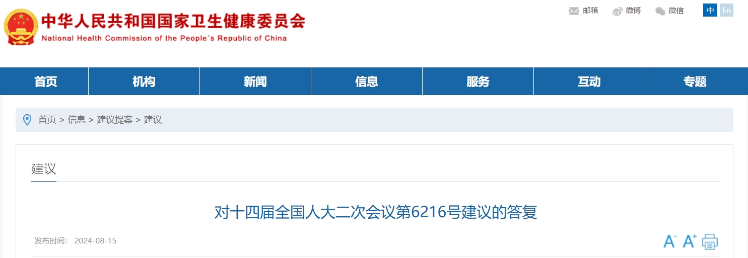 8月15日,國家衛(wèi)生健康委員會對十四屆全國人大二次會議第6216號建議的答復(fù)。