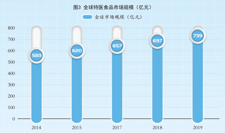據(jù)統(tǒng)計(jì),全球特醫(yī)食品從2014年的583億增長(zhǎng)到了2018年739億元,每年增長(zhǎng)超過(guò)6%。歐美國(guó)家因特醫(yī)食品發(fā)展較早,市場(chǎng)依然成熟,所以占了大部分市場(chǎng)份額。而我國(guó)目前市場(chǎng)規(guī)模僅占1.6%。與國(guó)外巨大的差距也預(yù)示著特醫(yī)食品在我國(guó)還具有巨大的發(fā)展?jié)摿Α?