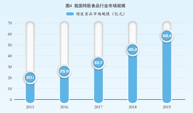 而我國(guó)也從2015年的20.1億迅速增長(zhǎng)到2019年的58.4億元,擴(kuò)大了近三倍的規(guī)模。年均復(fù)合增速達(dá)到30%以上,發(fā)展勢(shì)頭迅勐。人口老齡化、慢病患病率上升將進(jìn)一步提升特醫(yī)食品在中國(guó)的需求量。對(duì)標(biāo)發(fā)展成熟的歐美市場(chǎng),我國(guó)特醫(yī)食品未來(lái)的市場(chǎng)規(guī)模超百億元是必然趨勢(shì)。