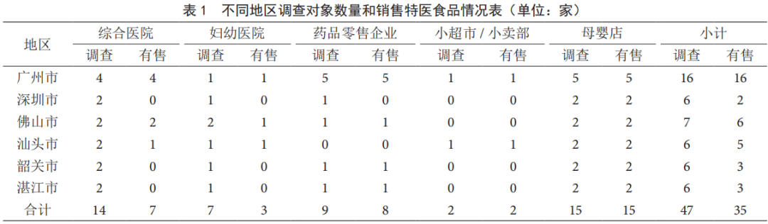 選取廣東省內(nèi) 47 家特殊醫(yī)學(xué)用途配方食品經(jīng)營店和醫(yī)療機構(gòu)作為調(diào)查對象,了解廣東省特殊醫(yī)學(xué) 食品經(jīng)營和管理現(xiàn)狀,分析銷售和使用過程中存在的風險和食品安全隱患,討論特殊醫(yī)學(xué)食品現(xiàn)行監(jiān)管政策存 在的問題并提出建議。