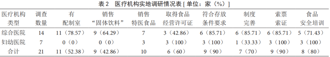 2.2 醫(yī)療機構(gòu)中特醫(yī)食品管理現(xiàn)狀 由表2可知,21 家醫(yī)療機構(gòu)中銷售特醫(yī)食品有 10 家,其中 6 家取得食品經(jīng)營許可證(60%),7 家建 立完善管理制度(70%),9 家完成索證索票(90%), 8 家有開展食品安全培訓(xùn)(80%),9 家特醫(yī)食品存放 合理(90%),9 家銷售“固體飲料”(42.86%)。