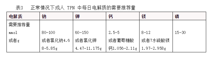 TPN 的營(yíng)養(yǎng)物質(zhì)必須完整,包括水、碳水化合物、氨基酸、脂肪、電解質(zhì)、維生素和微量元素。特殊情況下,也可加入某些特殊營(yíng)養(yǎng)物質(zhì)(如藥理營(yíng)養(yǎng)素),其獨(dú)特的藥理作用可能影響預(yù)后。