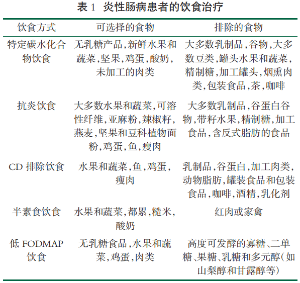 營養(yǎng)不良是 IBD 的常見表現(xiàn),因此,通過營養(yǎng)干 預在 IBD 患者的治療過程中發(fā)揮著核心作用。通過營 養(yǎng)干預,不僅可以緩解患者的營養(yǎng)不足,對于 IBD 患 者的疾病活動和癥狀也具有改善作用。多種飲食治療 方式在 IBD 病例中已被證明有效如表 1 所示,包括特 定碳水化合物飲食[47]、抗炎飲食[48]、排除飲食以及半素 食飲食等[49-50]。研究表明,通過飲食干預影響 IBD 發(fā)病 率的機制主要包括改變腸道微生物、促進腸道黏膜的 完整性以及影響免疫系統(tǒng) 3 個方面。