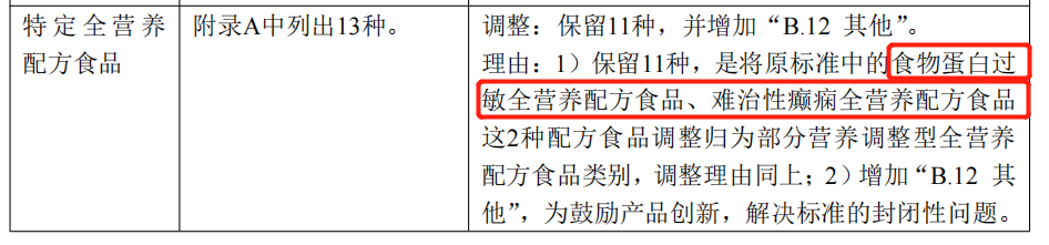 值得一提的是,在2022年12月,中國疾病預(yù)防控制中心營養(yǎng)與健康所和國家食品安全風(fēng)險評估中心共同制定的《食品安全國家標(biāo)準(zhǔn) 特殊醫(yī)學(xué)用途配方食品通則》(草案)中,將13種調(diào)整成了12種(如下圖),變更食物蛋白過敏全營養(yǎng)配方食品、難治性癲癇全營養(yǎng)配方食品為部分營養(yǎng)調(diào)整型全營養(yǎng)配方類別,新增了1個其他類別。由于該通則為草案,本文將延續(xù)GB29922-2013的13種分類。