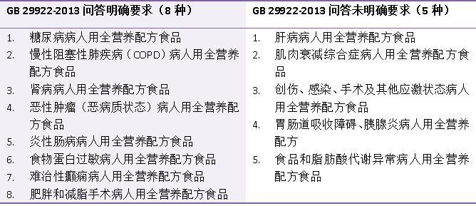 GB29922-2013將特定全營養(yǎng)配方食品分為13種:①糖尿病全營養(yǎng)配方食品,②呼吸系統(tǒng)疾病全營養(yǎng)配方食品,③腎病全營養(yǎng)配方食品,④腫瘤全營養(yǎng)配方食品,⑤肝病全營養(yǎng)配方食品,⑥肌肉衰減綜合征全營養(yǎng)配方食品,⑦創(chuàng)傷、感染、手術(shù)及其他應(yīng)激狀態(tài)全營養(yǎng)配方食品,⑧炎性腸病全營養(yǎng)配方食品,⑨食物蛋白過敏全營養(yǎng)配方食品,⑩難治性癲癇全營養(yǎng)配方食品,?胃腸道吸收障礙、胰腺炎全營養(yǎng)配方食品,?脂肪酸代謝異常全營養(yǎng)配方食品,?肥胖、減脂手術(shù)全營養(yǎng)配方食品。[1-3]