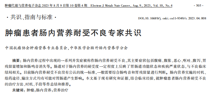 【專家共識】腫瘤患者腸內(nèi)營養(yǎng)耐受不良專家共識