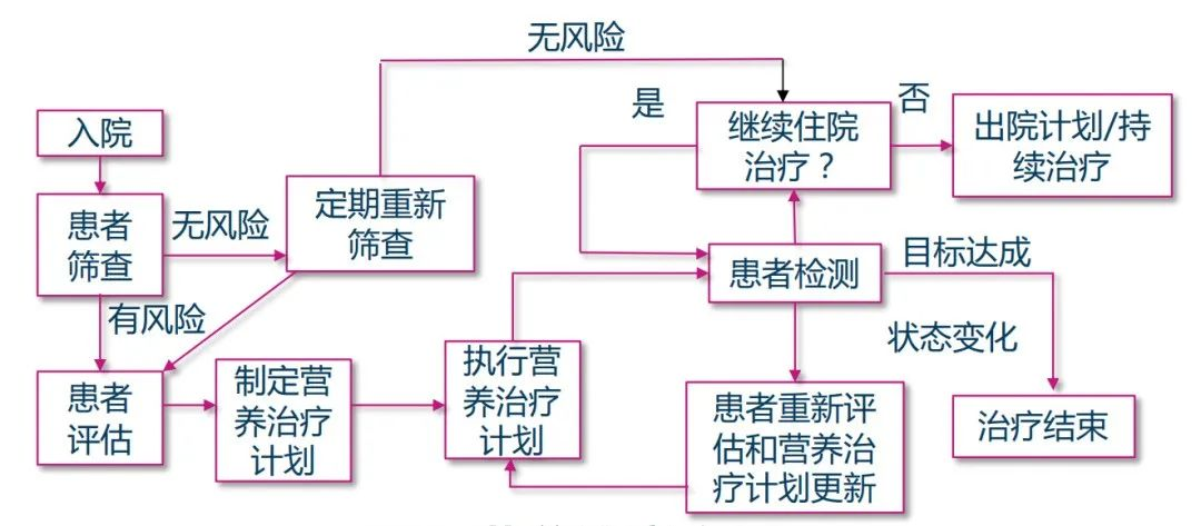 對于營養(yǎng)狀況良好的成人患者,能夠耐受短期攝入不足,只需要保證充分的水、電解質(zhì)攝入,并提供適量的葡萄糖即可。對于營養(yǎng)不足的住院患者,尤其是老年人、惡性腫瘤及其他慢性消耗性疾病患者,營養(yǎng)不良問題尤為突出,如果不能及時改善營養(yǎng)狀態(tài),很可能加重原發(fā)病和增加并發(fā)癥的發(fā)生。此時額外的營養(yǎng)支持治療能為患者提供基本需求的能量、蛋白質(zhì)、液體及微量營養(yǎng)素,并最大限度降低疾病發(fā)生和殘疾的風險。規(guī)范的營養(yǎng)診療流程一般包括營養(yǎng)篩查、營養(yǎng)評定和營養(yǎng)干預三步曲。在患者入院時,會結合患者營養(yǎng)受損狀況、疾病嚴重程度和年齡進行初步的營養(yǎng)篩查,對有營養(yǎng)風險的患者;再根據(jù)患者的體重、身高、年齡、性別和活動水平的方程,對患者能量需求進行營養(yǎng)評估并制定和實施營養(yǎng)治療,在干預中不斷監(jiān)測患者各營養(yǎng)指標是否到達目標范圍。